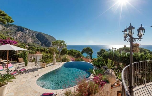 La terrasse donne sur la piscine et le jardin avec une vue panoramique de 180º sur la mer Méditerranée et les falaises côtières environnantes.