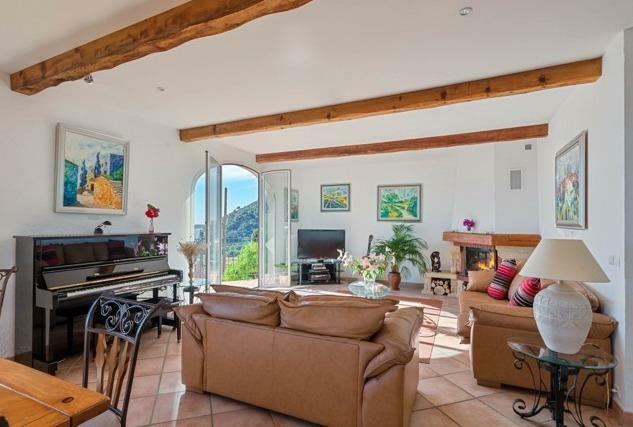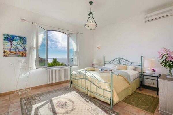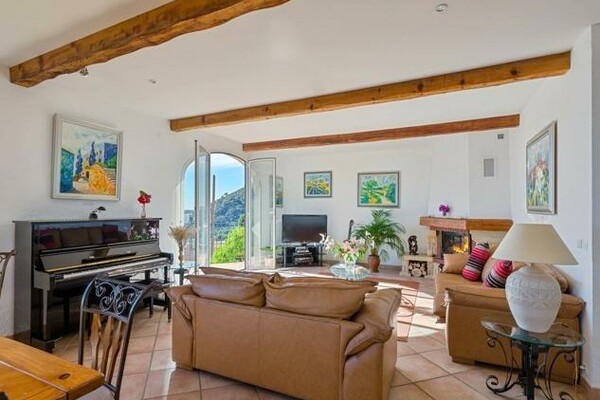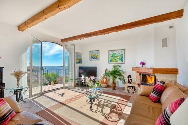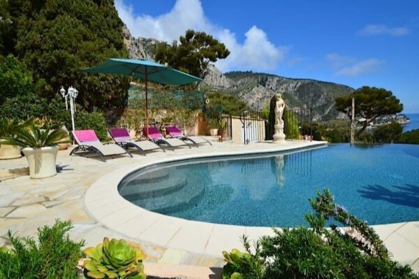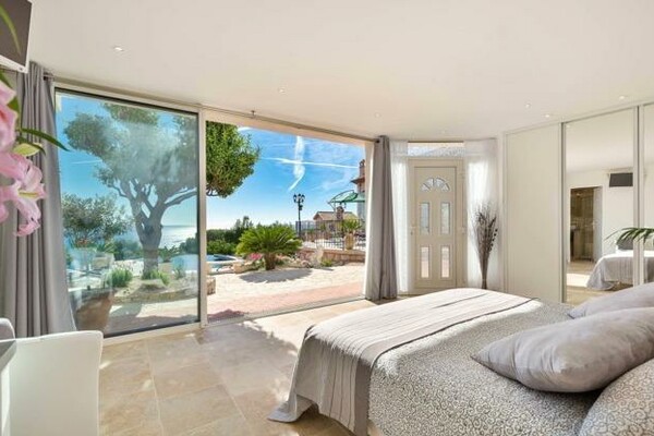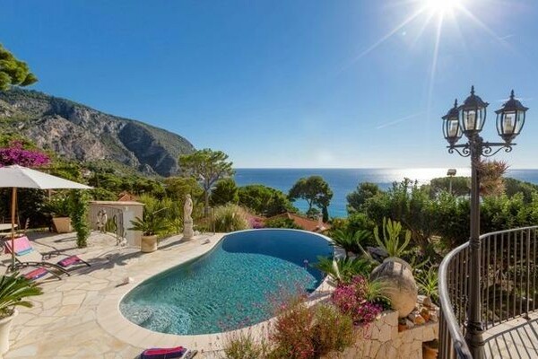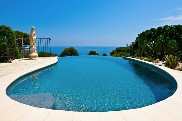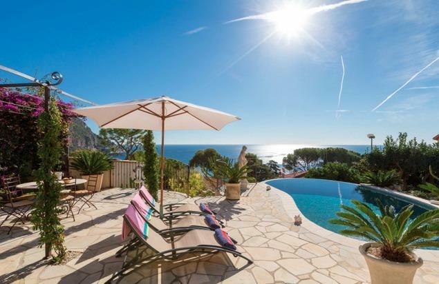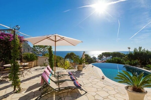 La terrasse donne sur la piscine et le jardin avec une vue panoramique de 180º sur la mer Méditerranée et les falaises côtières environnantes.